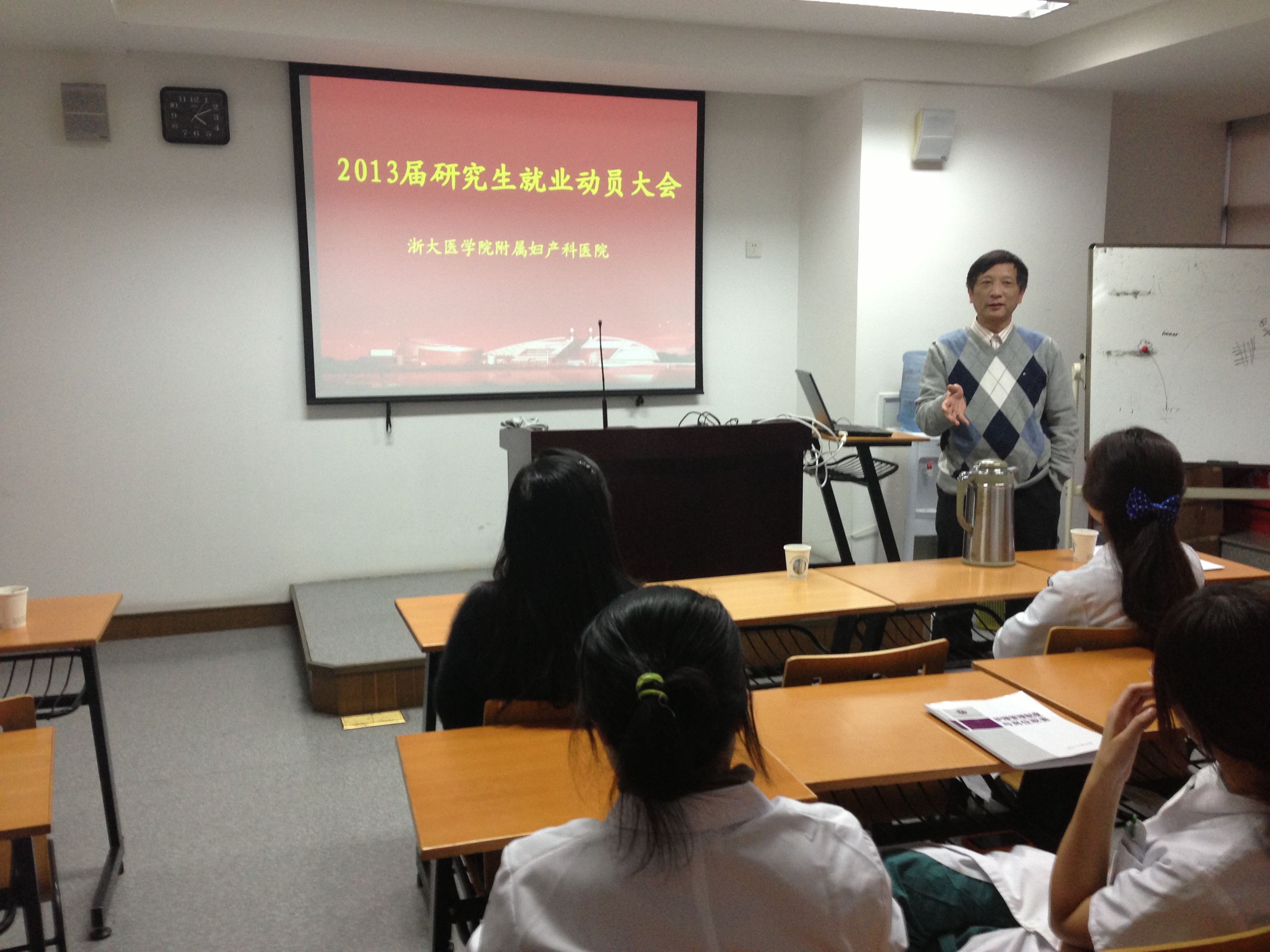 最后,汪苏华老师以大量详实的数据,形象的图表总结了2010-2012三年来妇产科研究生生源状况、就业率、就业地域分布、就业行业分布、就业层次分布、浙江省内就业地域分布等各个方面的情况。他指出:近年来我校医学院毕业生虽有增加趋势,但我院前三年毕业生就业率均达到100%,就业形势比较乐观。随后,汪老师对同学们就业方面的问题,做了深刻的分析。他希望同学们能够站在国际水平的高度,以国际视野规划自己的人生道路。最后,汪书记建议同学们成立就业互助小组,加强同学们关于就业方面的信息交流,并提醒即将毕业的同学们签约要慎重,尤其是毁约更要慎重,在就业操环节中要注重诚信。