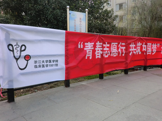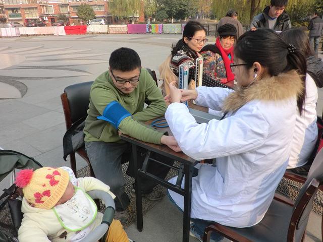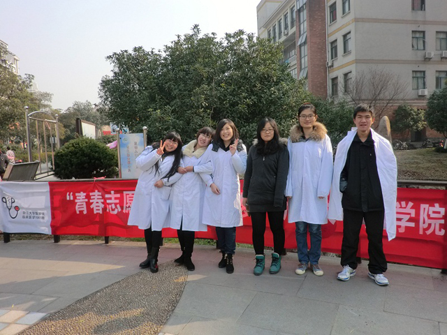 12月23日上午,医学院临床医学1001班在望月公寓中心广场开展“青春志愿行,共筑中国梦”社区志愿者服务活动,为望月公寓的居民提供测量血压服务和秋冬健康知识宣传。 早上八点,临床医学1001班的志愿者来到望月公寓,拉起横幅,从望月公寓办公室搬出桌椅,准备好血压计和听诊器。我们的活动还未开始,就有几位爷爷奶奶上前询问,这让我们感到意外惊喜。居民说上次有浙大的学园志愿者来望月公寓义诊,觉得大学生为社区服务很有意义。虽然天气寒冷,广场边的水面也结了一层薄冰,但是我们丝毫没有退缩,而是坚持为居民量血压、宣传健康知识。量血压时,其中我们碰到以为家乡是湖南的老大爷,和来自湖南的杨慧同学聊起了天,从家乡聊到家人,从家人聊到医学知识,今天又是冬至,聊得更是欢乐了。同时,我们还拿着宣传单进一些商店,为商店店主、雇员他们宣传知识,在他们忙于自己的工作之时也能了解到一些秋冬保健知识。 虽然已经过了12月5日志愿者日,但大学生时刻都应投身志愿服务,为社会奉献。经过此次班级组织望月公寓社区义诊,我们将继续积极参与社区服务,参与公益活动,把服务社会当作一种生活方式。 文/陈雍 摄影/陆雨楠 到场拉起横幅,做好活动准备 一家老小在量血压,孩子在边上和爸爸对视 一名志愿者在给一位爷爷讲解秋冬养生知识 志愿者们在活动之后合影留念