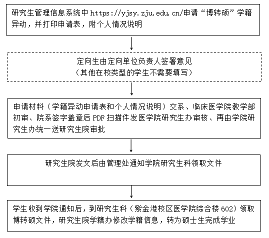 根据《浙江大学研究生学籍管理实施办法》(浙大发研〔2017115号)文件的规定:“直博生入学3年以上、硕博连读生转博后1年以上者,由于各种原因,不宜继续攻读博士学位但可以达到硕士研究生学业要求的,经本人申请,导师(或导师组主导师)和学院(系)同意、研究生院审批,可以转为攻读硕士研究生。”为进一步规范研究生管理,现将医学院博转硕相关事项通知如下: