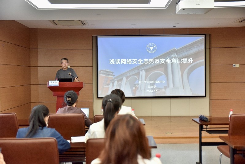 会议特邀浙江大学信息技术中心网络安全部部长、浙大-安恒联合校园数字安全实验室副主任常志华教授作《浅谈网络安全态势及安全意识提升》主题报告。
