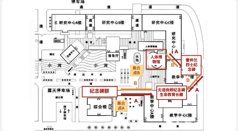 室外-院史路线:医学生誓言碑,韩清泉、王季午纪念雕像;樱花林、无语良师纪念碑;曹仲兰烈士纪念像、生命教育长廊